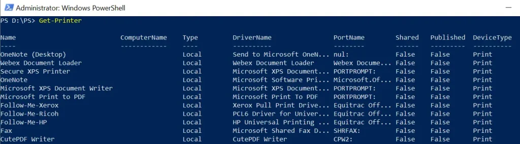Step 1. Right-click the Start button and select “PowerShell (Admin)”. Type: Get-Printer to see all printers.